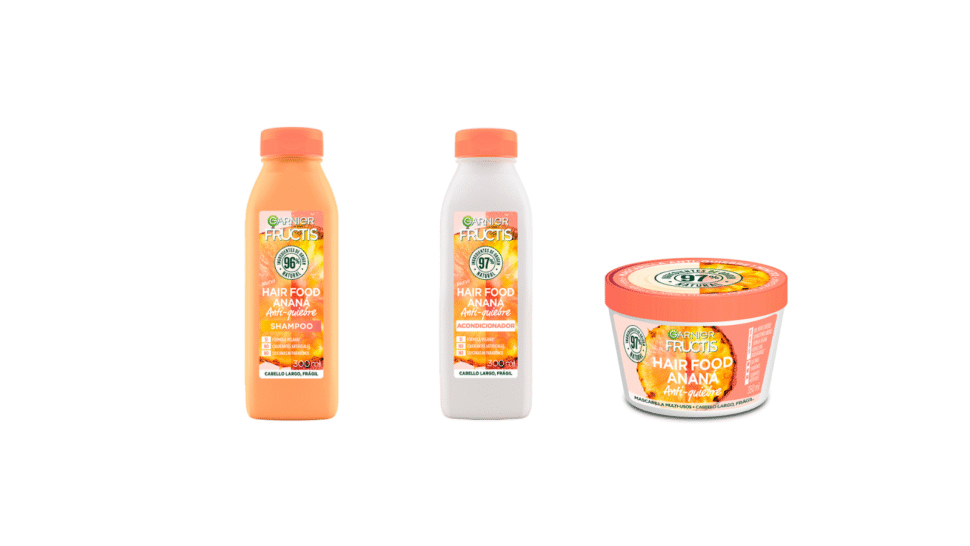 Esta nueva línea de Garnier está compuesta por un shampoo transparente sin siliconas, con una fórmula limpiadora a base de tres agentes de origen vegetal y 100% biodegradables. Un acondicionador nutritivo, que gracias a sus ingredientes naturales aporta flexibilidad, suavidad y facilita el desenredado. Y una mascarilla 3 en 1 enriquecida con extracto de ananá, de textura cremosa y rica en nutrientes e hidratación. Podés usarla como crema de tratamiento (dejándola actuar unos minutos antes de enjuagar), como acondicionador, aplicándolo de medios a puntas y luego enjuagando, y como crema para peinar (sin enjuague).