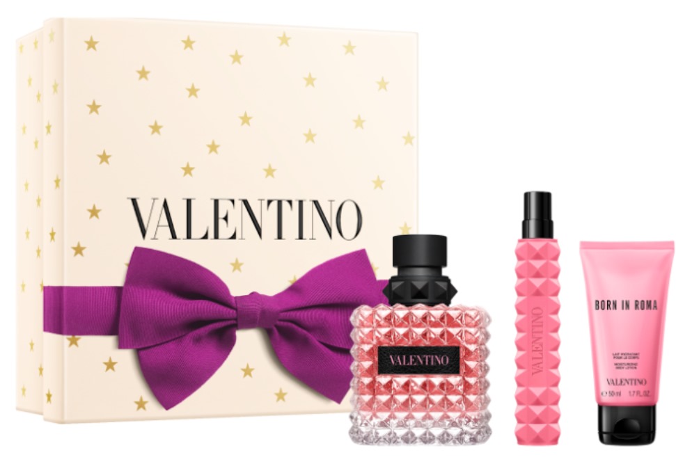 Este set incluye una fragancia Born in Roma Donna EDP 100 ML + Body Lotion 50 Ml + Talla 10ML