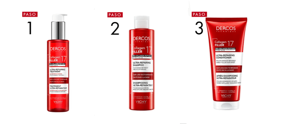 Dercos Collagen Filler 17 cuenta con una rutina de 3 pasos diseñada para maximizar la absorción de activos: